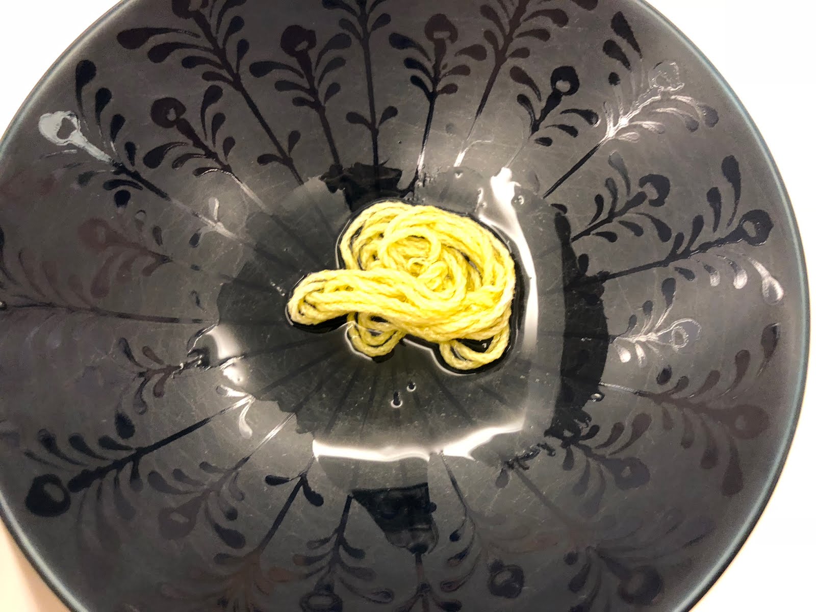 將棉線的中心點放在麵團上方往下繞轉一圈再往斜上方繞,最後再繞另一個方向,尾端打一個結完成
