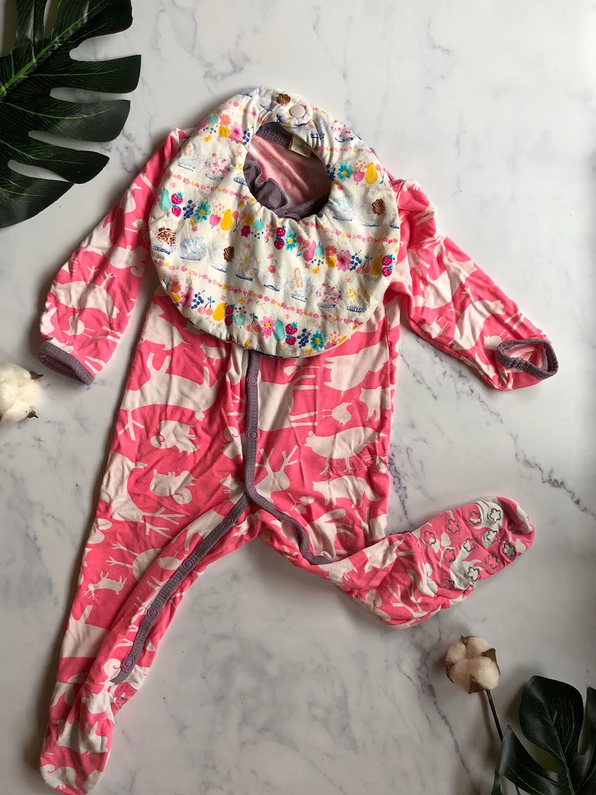 底色為桃紅色,白色的動物圖案童趣不幼稚,滾上一圈粉嫩紫收邊很優雅,