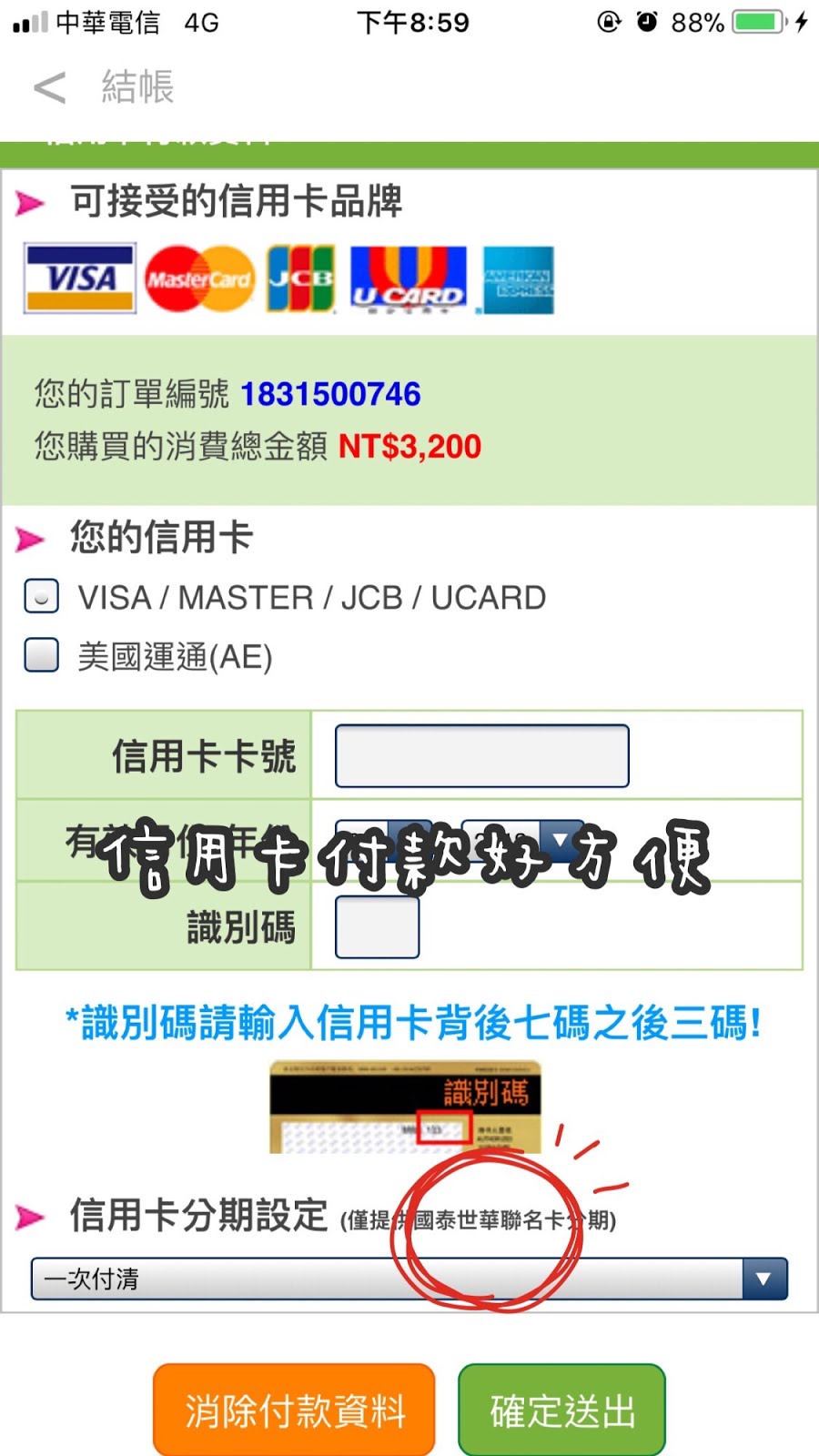 可以線上刷卡,國泰可分期哦(我是覺得買菜不要分期啦..)
