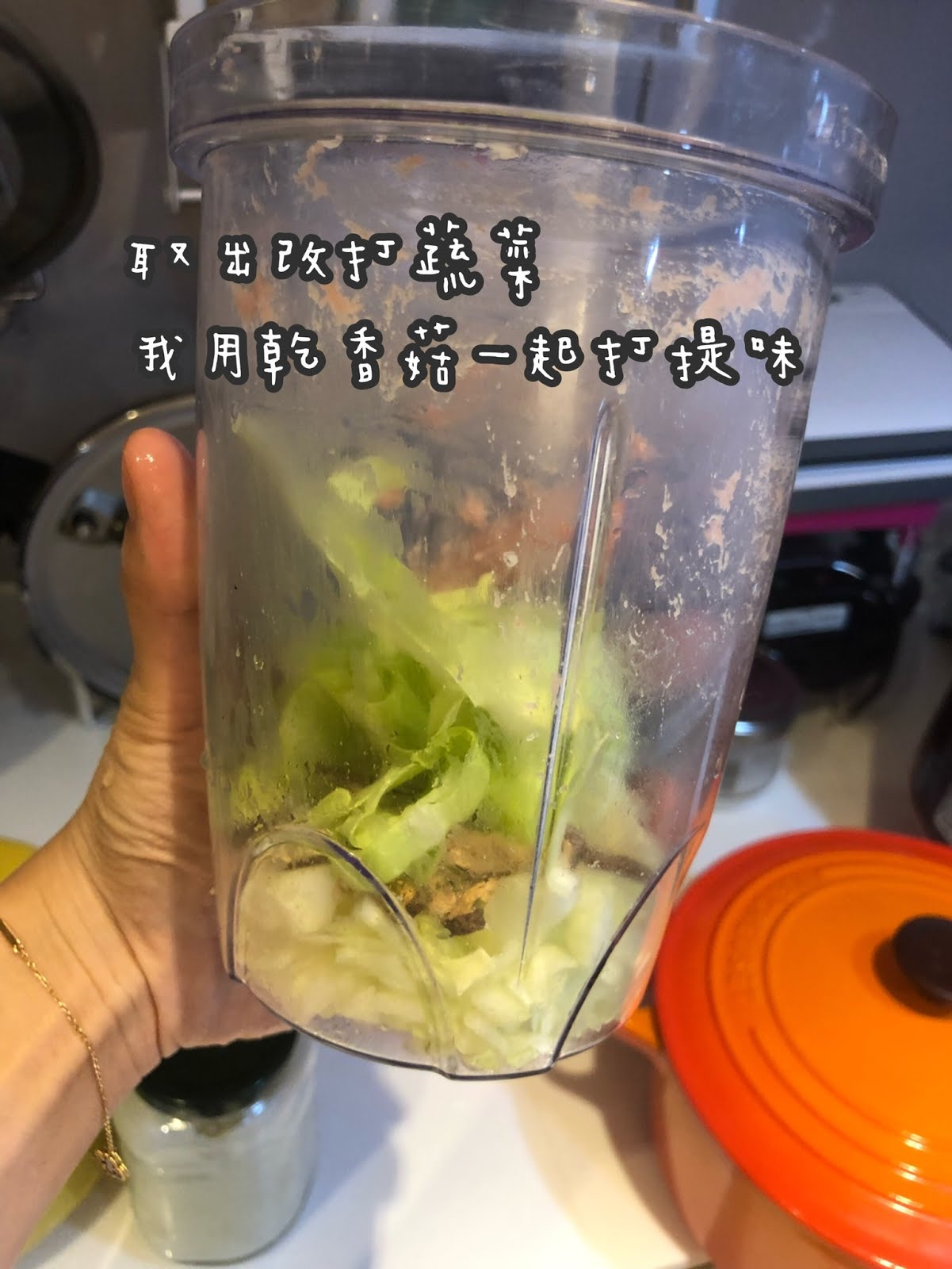 取出絞肉來打蔬菜,用生的即可~我利用高麗菜葉不要的硬梗加入。