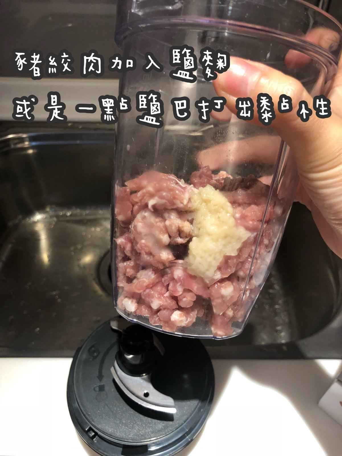 趁煮的時候來做內餡,絞肉要先冰到微凍再打才好吃